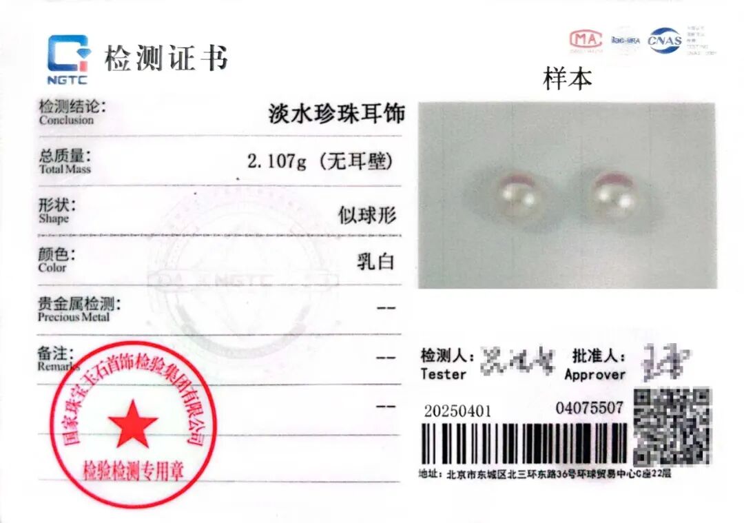珠宝国检(NGTC)珍珠检测证书样本