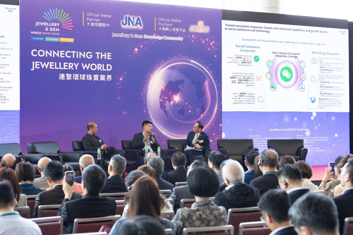 会议亦设有专题环节,探讨数码科技如何革新珠宝零售业。由「香港珠宝首饰业商会」主席黄绍基先生主持,并邀请周大福首席品牌官陈义邦先生及腾讯智慧零售行业总经理李洋先生参与讨论。讲者分享了智能零售方案如何提升营运效率、推动业务增长及加强顾客互动。