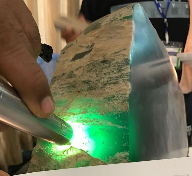 2014年缅甸公盘惊现底价最高的一块石头,出自木那场口,史上底价最高的毛料之一。这块翡翠原石是全赌料,冰底飘绿花,种水非常好,一打灯就泛开一片绿。看这种水,出一个满绿手镯就是价值过亿,而这块翡翠原石有足足233公斤。底价六千万欧元,折合人民币6亿,一般来说,成交价都会比底价高几倍这块底价超高的翡翠原石,就算以底价拍下来,加税到中国内地,也要10亿人民币以上超高的赌注+赌性,导致这块石头流拍,这块石头流拍后,货主自己将石头切开了。