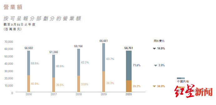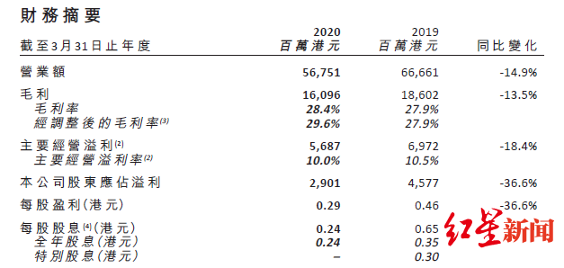 按地区来看,内地2020财年同店销售下降15.1%。受香港经营环境疲弱的影响,港澳地区同店销售于2020财政年內减少38.7%。
