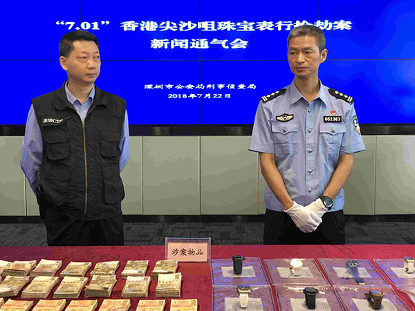 7月22日,深圳警方召开新闻发布会透露,近日,深圳警方在公安部、广东省公安厅的统一指挥下,与香港警方紧密联手,成功侦破香港“20180701”尖沙咀某珠宝表行抢劫案,抓获犯罪嫌疑人5名,缴获12块名表、174万港币及其他赃物一批。