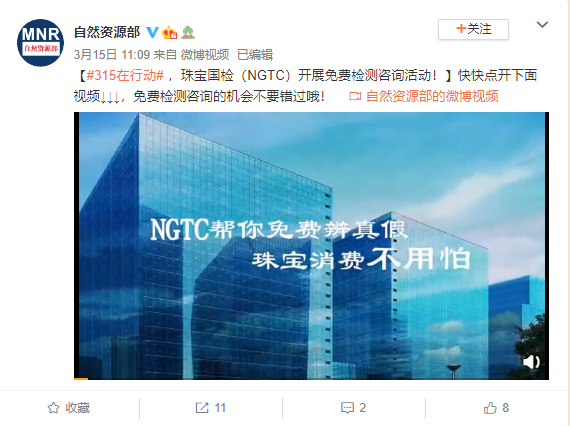 珠宝国检(NGTC)助你维权系列报道(十一)丨“3.15NGTC在行动·助你维权”视频短片获自然资源报推荐登录自然资源部官方微博