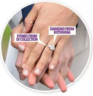 这枚订婚戒指上共有三颗钻石,且都具有特殊的意义。位于中间的钻石产自博兹瓦纳,是哈里王子多次访问的地方,戒指外侧的两颗钻石,来自哈里王子已故母亲戴安娜王妃的私人收藏。三颗钻石分别代表着友谊、爱与忠诚,以及两人的过去、现在和未来。
