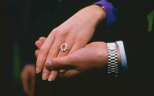 1986年英国安德鲁王子(PrinceAndrew)与 Sarah Ferguson (尤金妮公主母亲)订婚时,订婚戒指就是一枚椭圆形切割缅甸红宝石,呈明亮的红色,围镶10颗水滴形钻石。